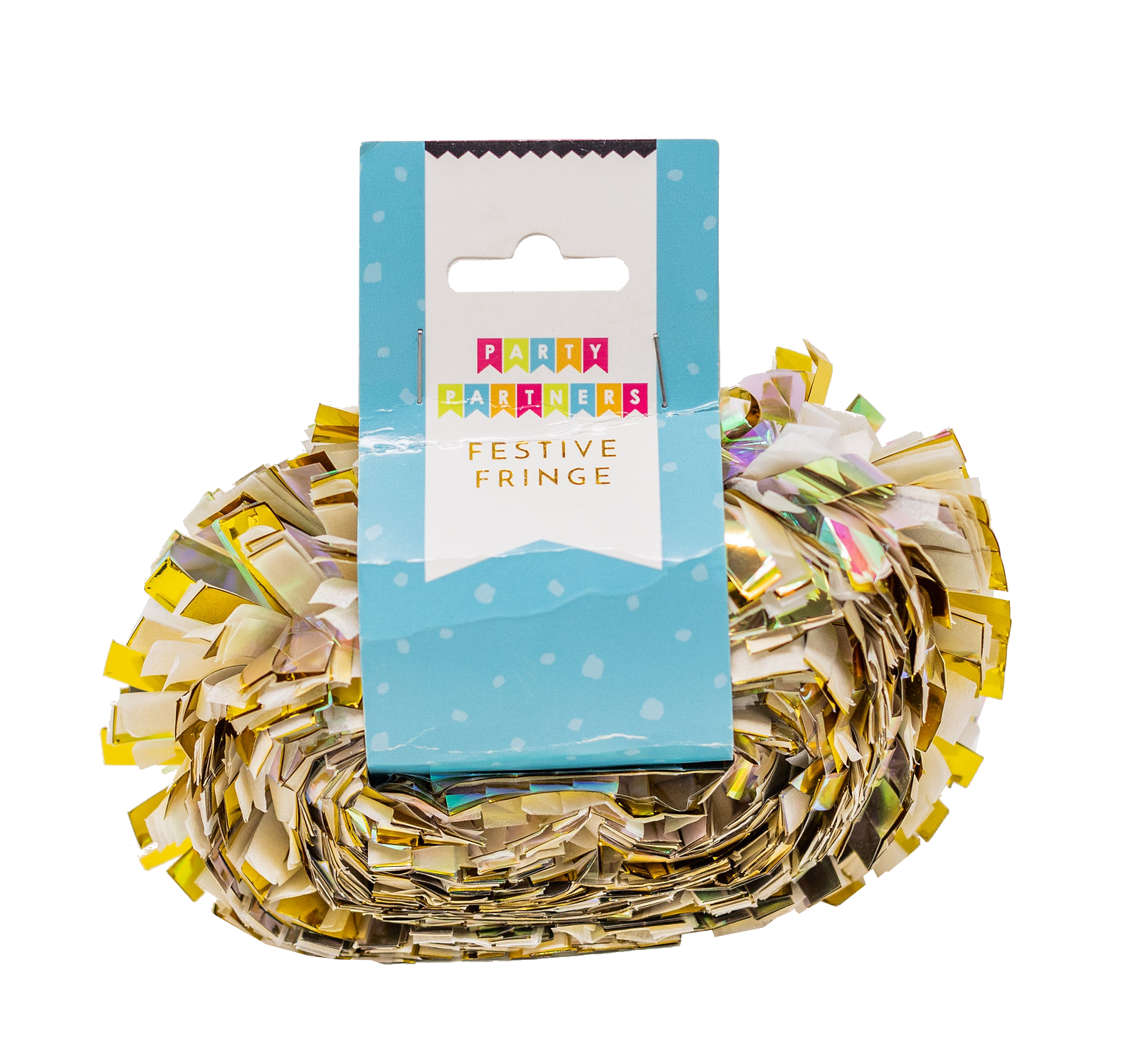 1 banner per package. 3in x 16.5ft. Hang tag. Iridescent mylar & white, metallic gold tissue paper.