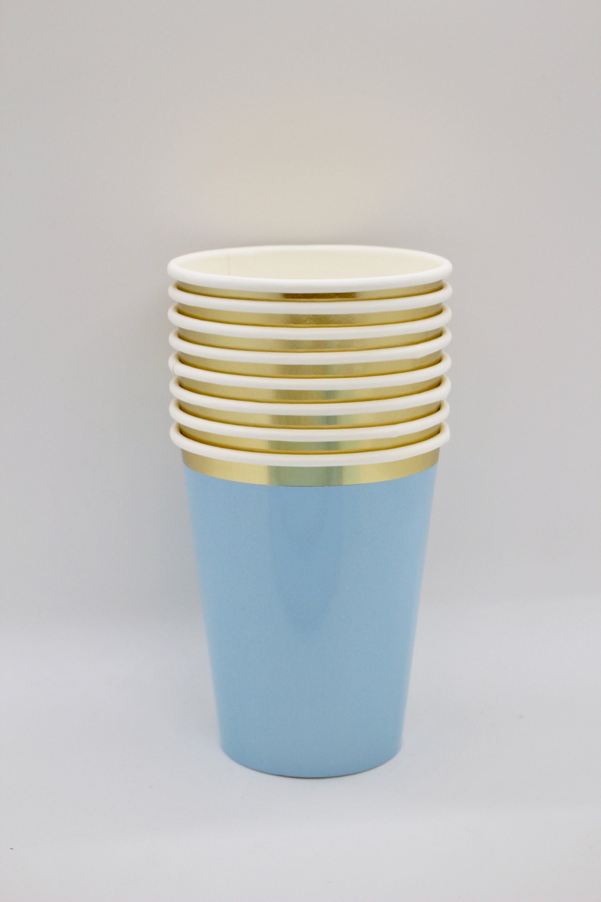 Looking to add a few more cups to the mix?! Trying to mix and match dinnerware for a unique place setting?! Well, look no further than these light blue cups with gold edging! Set of 8.