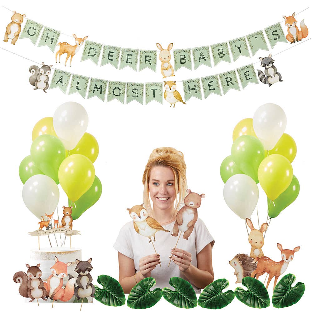 The banner for the party kit reads, "Oh deer, baby's almost here".